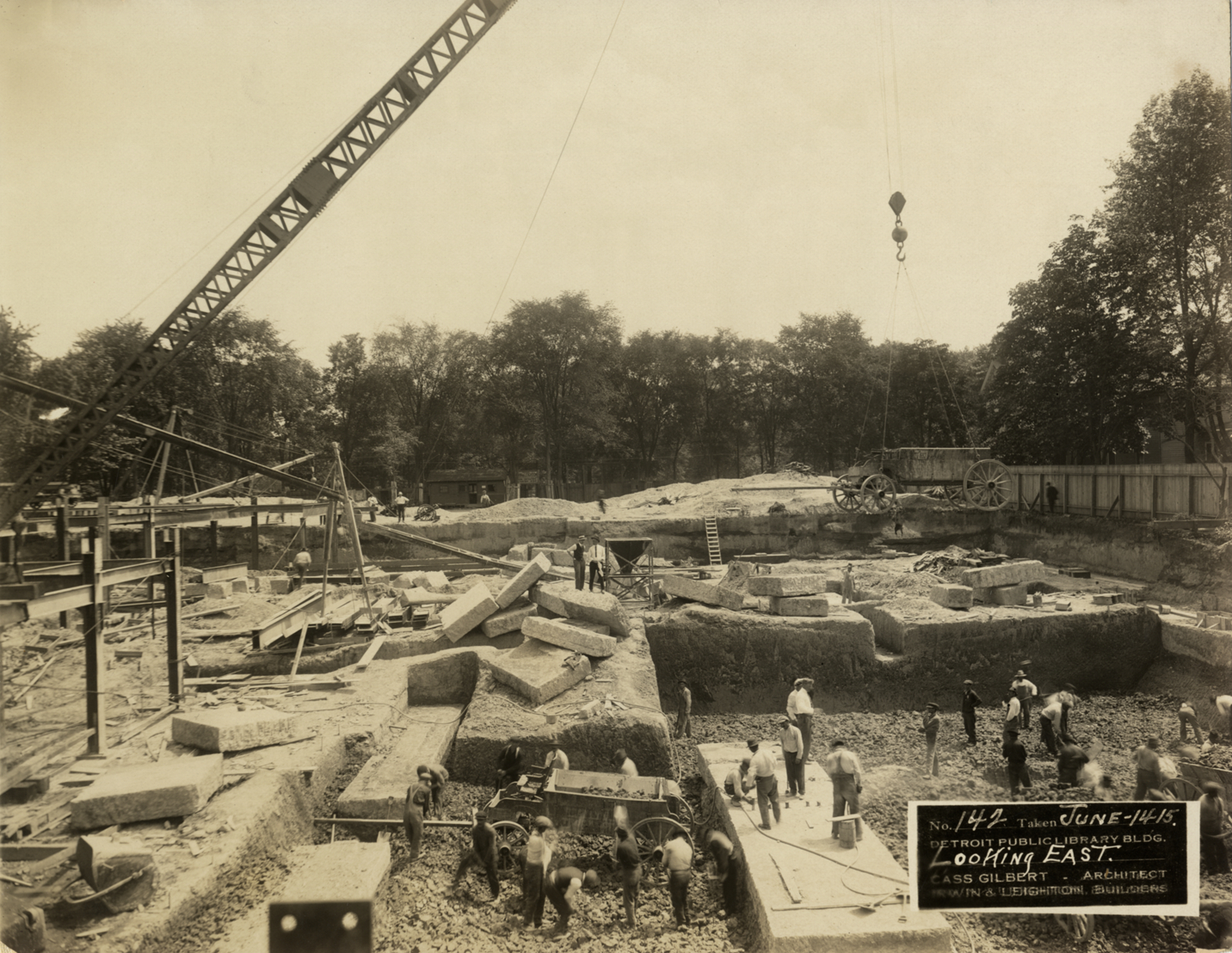 View of men working on construction site for foundation of Main Library, Detroit Public Library. Slabs of stone on ground; wagon suspended from crane. Printed on front: "No. 142. Taken June 14-15. Detroit Public Library bldg. Looking east. Cass Gilbert, architect. Irwin & Leighton, builders." Stamped on back: "Charles Ruel Messinger, commercial photographer, 1646 Woodward Ave., Detroit, Mich., phone North 6298."