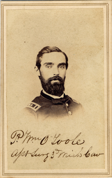 Portrait photograph of Patrick William O'Toole in uniform, from the Civil War 3rd Michigan Cavalry picture album. Handwritten on front: "P. Wm. O'Toole, Asst. Surg., 3rd Mich. Cav."