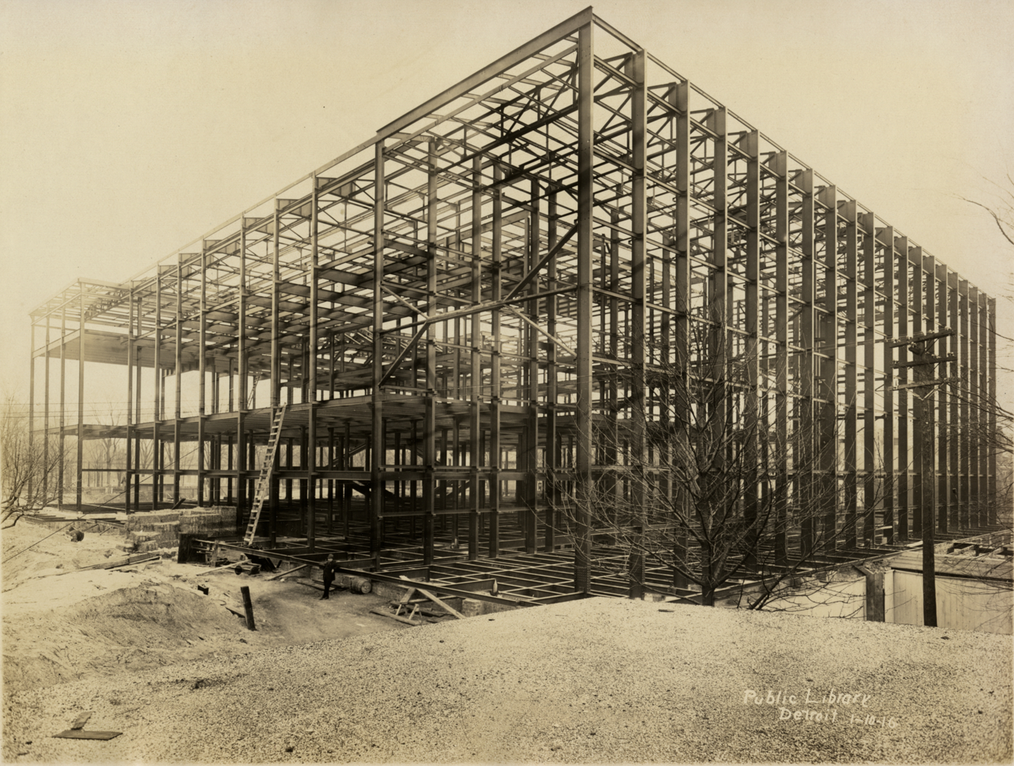 View of framework of Main Library, Detroit Public Library during construction. Printed on front: "Public Library, Detroit. 1-10-16." Stamped on back: "Babcock and Dolbey, 92-94 Griswold St., Detroit, Mich., Cadillac 3189." Handwritten on back: "General view looking east."