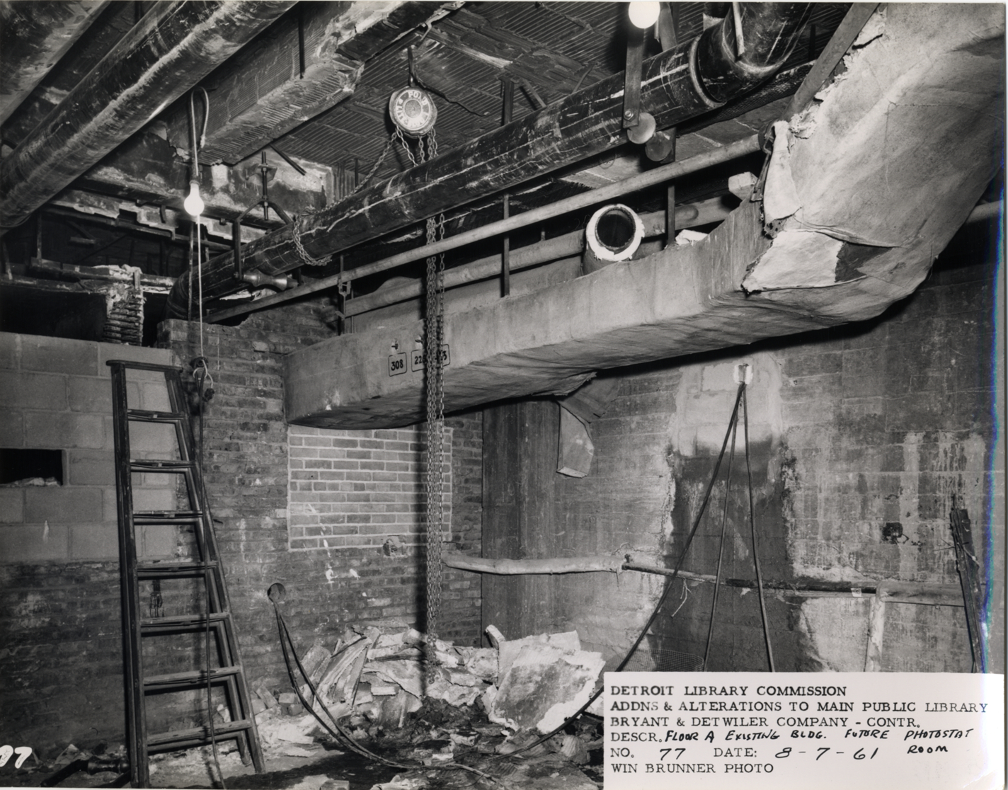 View of room on floor A, Main Library, Detroit Public Library during construction. Pulley with chain and ductwork overhead; ladder leans against wall. Printed on front: "Detroit Library Commission. Addns & alterations to Main Public Library. Bryant & Detwiler Company, contr. Descr. floor A, existing bldg., future photostat room. No. 77. Date: 8-7-61. Win Brunner, photo."