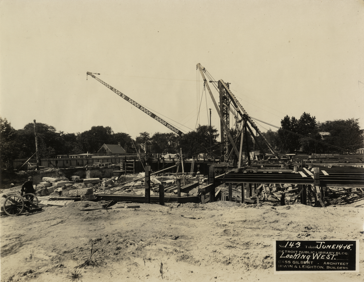 View of framework of Main Library, Detroit Public Library during construction. Cranes on construction site. Printed on front: "No. 143. Taken June 14-15. Detroit Public Library bldg. Looking west. Cass Gilbert, architect. Irwin & Leighton, builders." Stamped on back: "Charles Ruel Messinger, commercial photographer, 1646 Woodward Ave., Detroit, Mich., phone North 6298."
