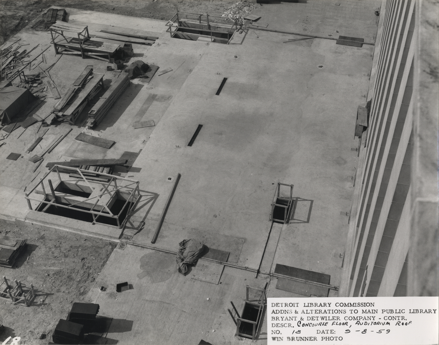 View of auditorium roof and concourse floor, Main Library, Detroit Public Library during construction. Construction materials on site. Printed on front: "Detroit Library Commission. Addns & alterations to Main Public Library. Bryant & Detwiler Company, contr. Descr. concourse floor, auditorium roof. No. 18. Date: 9-8-59. Win Brunner, photo."