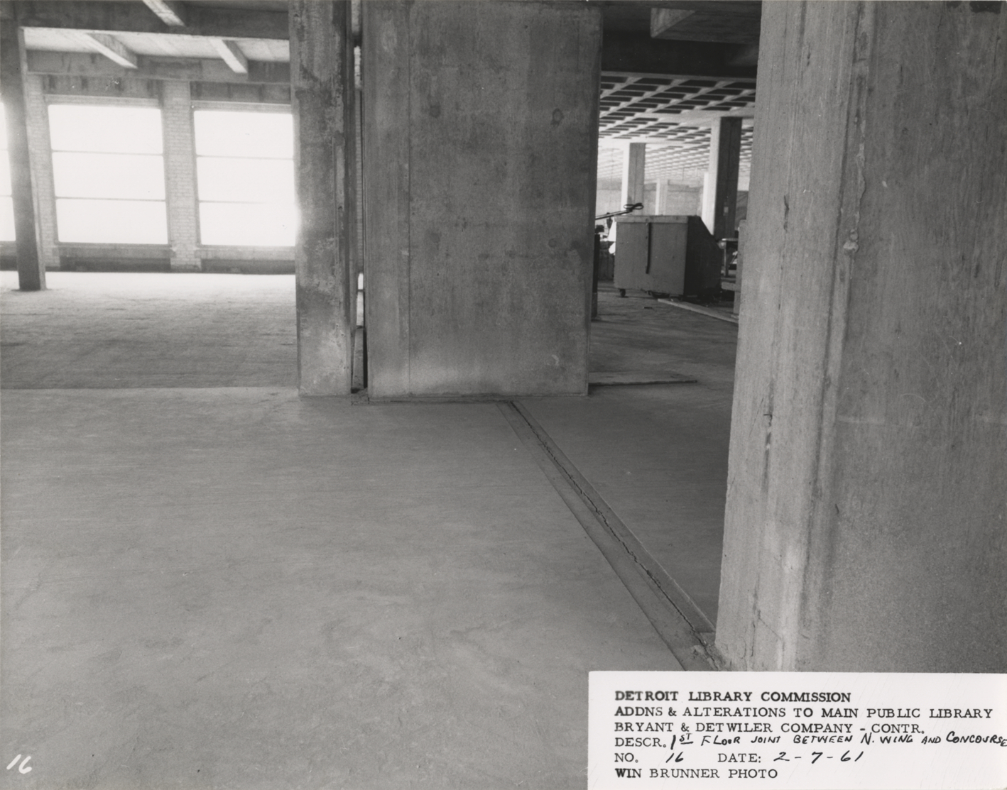View of first floor joint between North Wing and concourse, Main Library, Detroit Public Library. Rolling bin in background. Printed on front: "Detroit Library Commission. Addns & alterations to Main Public Library. Bryant & Detwiler Company, contr. Descr. 1st floor joint between N. Wing and concourse. No. 16. Date: 2-7-61. Win Brunner, photo."