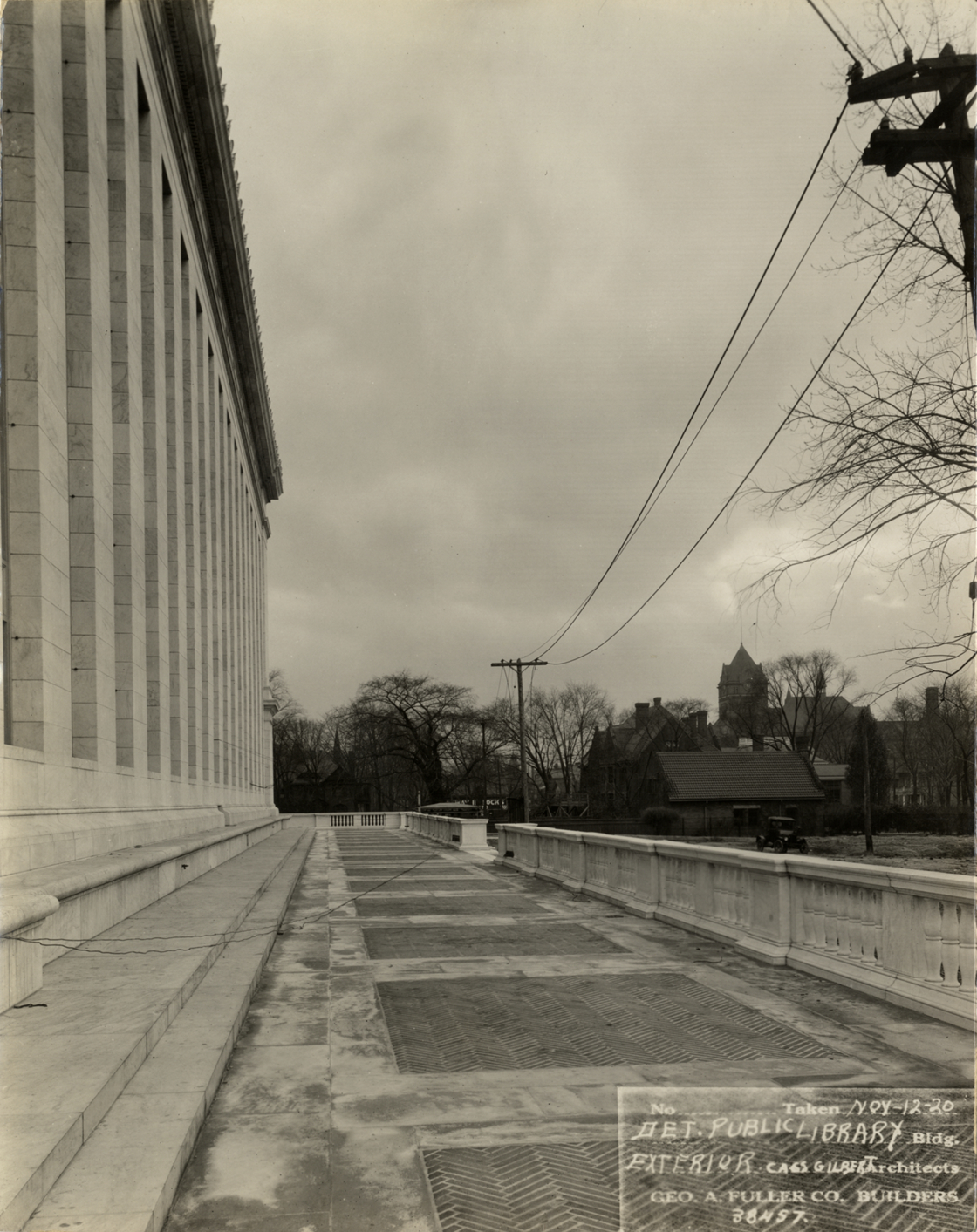 View of terrace and exterior of Main Library, Detroit Public Library during construction. Brick arranged in herringbone pattern; terrace bordered by balustrade. Houses and clock tower in background. Printed on front: "No. [blank]. Taken Nov-12-20. Det. Public Library bldg., exterior. Cass Gilbert, architects. Geo. A. Fuller Co., builders, 38457." Stamped on back: "Manning Bros., commercial photographers, 504-505 Lincoln Building, corner State and Park Sts., Detroit, Mich."