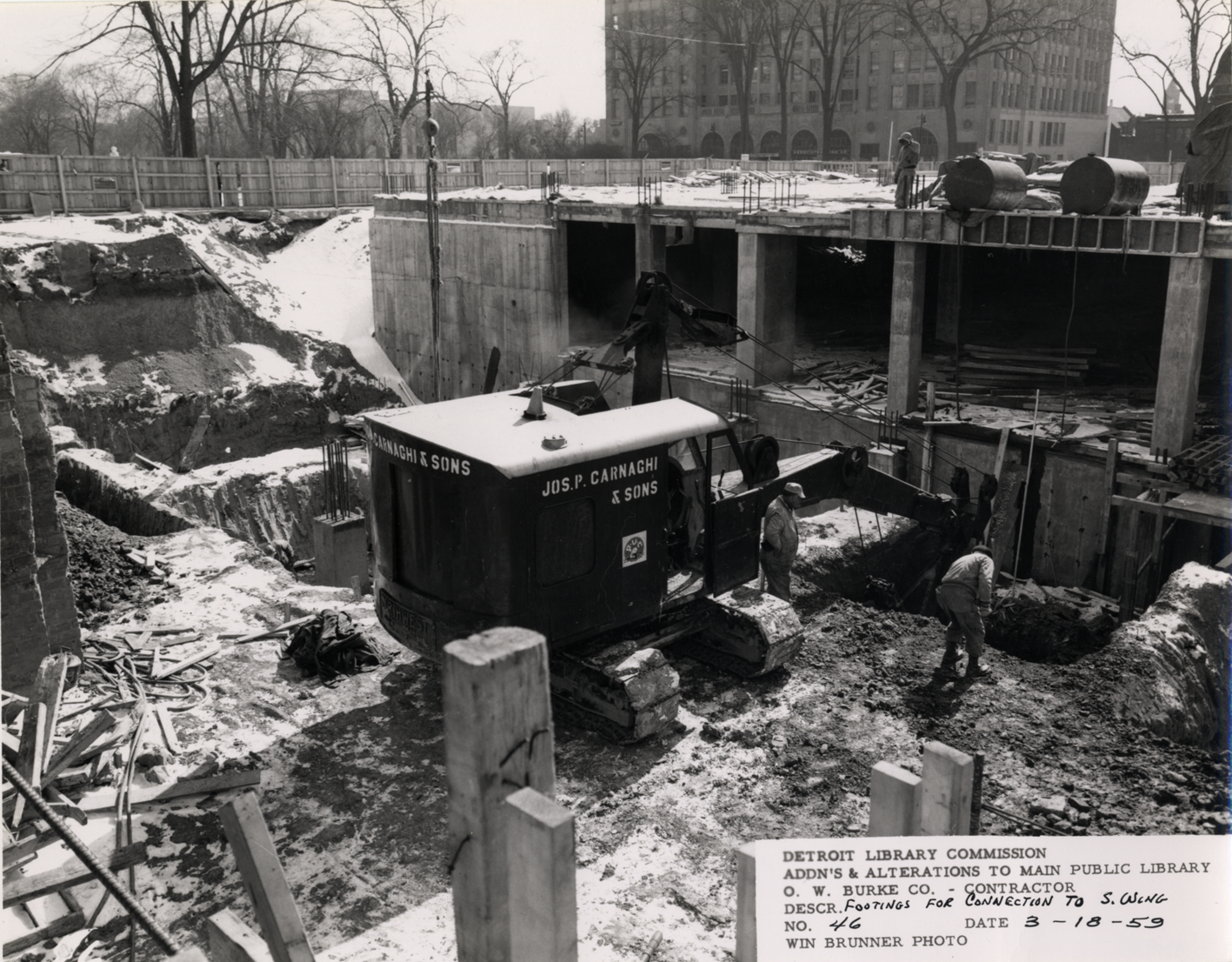 View of construction workers creating footings for connection to South Wing, Main Library, Detroit Public Library. Jos. P. Carnaghi & Sons power shovel in foreground. Printed on front: "Detroit Library Commission. Addn's & alterations to Main Public Library. O.W. Burke Co., contractor. Descr. footings for connection to S. Wing. No. 46. Date 3-18-59. Win Brunner, photo."