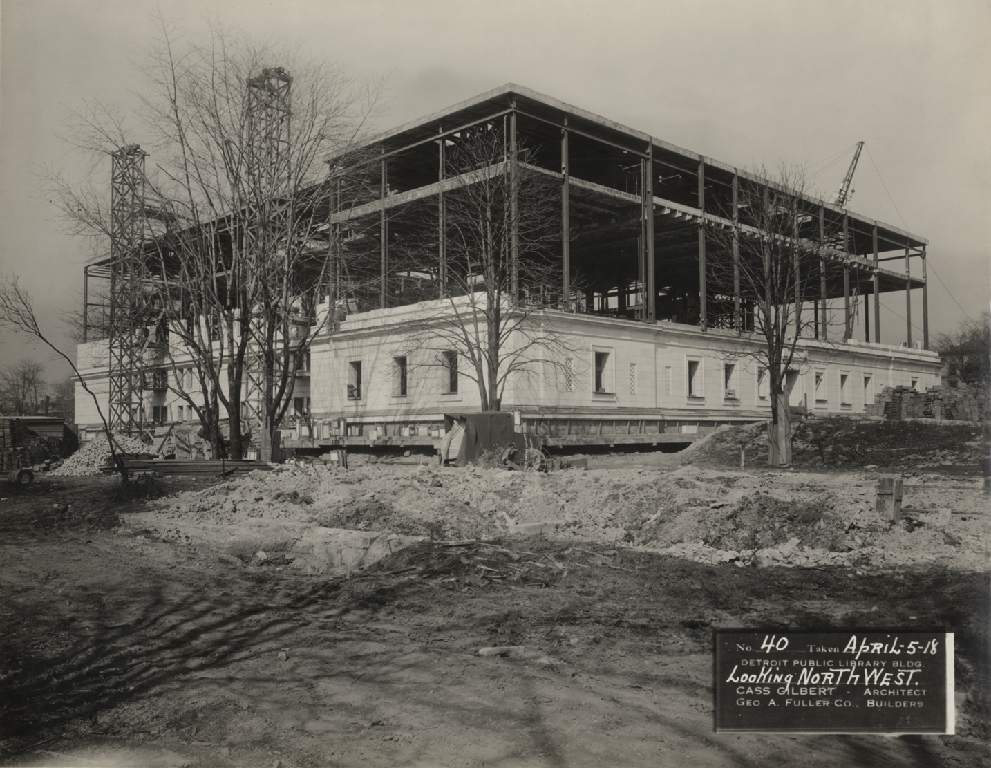 View at an angle of Main Library, Detroit Public Library during construction, facing northwest. Structural frame of building with partially completed facade. Scaffolding on side of building; trees in foreground. Printed on front: "No. 40. Taken April-5-18. Detroit Public Library bldg., looking northwest. Cass Gilbert, architect. Geo. A. Fuller Co., builders." Stamped on back: "Charles R. Messinger, commercial photographer, 1646 Woodward Ave., Detroit, Mich., Market 6298."