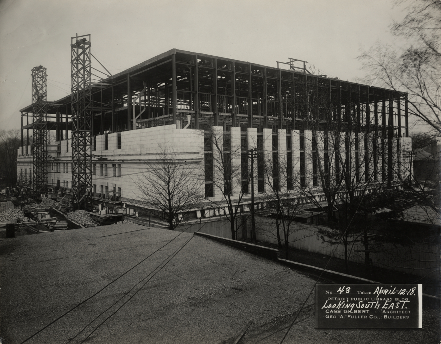 View at an angle of Main Library, Detroit Public Library during construction, facing southeast. Structural frame of building with partially completed facade. Scaffolding on side of building; trees on right. Printed on front: "No. 43. Taken April-12-18. Detroit Public Library bldg., looking southeast. Cass Gilbert, architect. Geo. A. Fuller Co., builders." Stamped on back: "Charles R. Messinger, commercial photographer, 1646 Woodward Ave., Detroit, Mich., Market 6298."