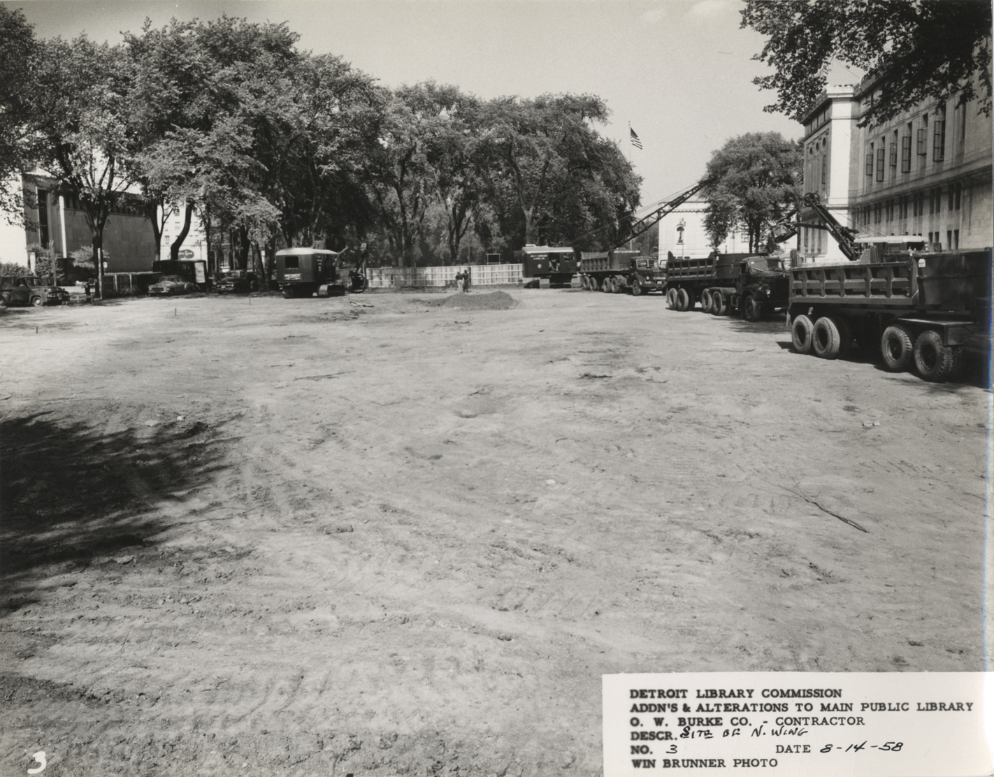Site of North Wing, Main Library, Detroit Public Library. Empty lot with old library building on right; cranes and trucks in background. Printed on front: "Detroit Library Commission. Addn's & alterations to Main Public Library. O.W. Burke Co., contractor. Descr. site of N. Wing. No. 3. Date 8-14-58. Win Brunner, photo."