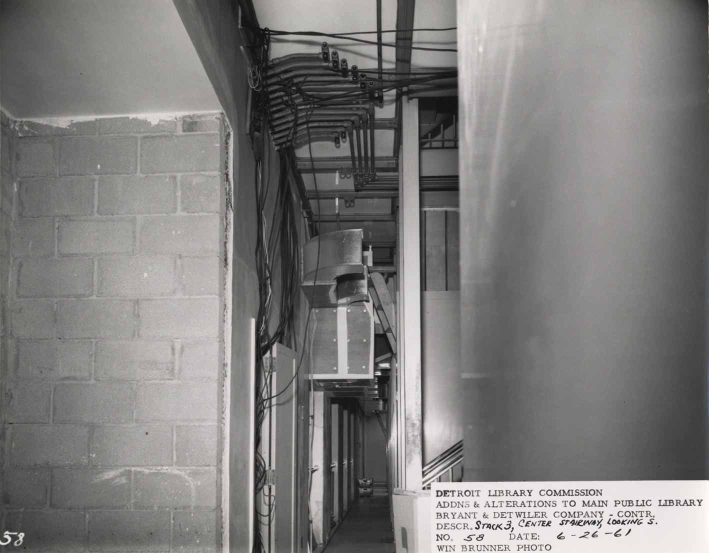 View of Stack 3, Main Library, Detroit Public Library, during construction. Partial view of center stairway; ductwork and pipes overhead. Printed on front: "Detroit Library Commission. Addns & alterations to Main Public Library. Bryant & Detwiler Company, contr. Descr. Stack 3, center stairway, looking s. No. 58. Date: 6-26-61. Win Brunner, photo."
