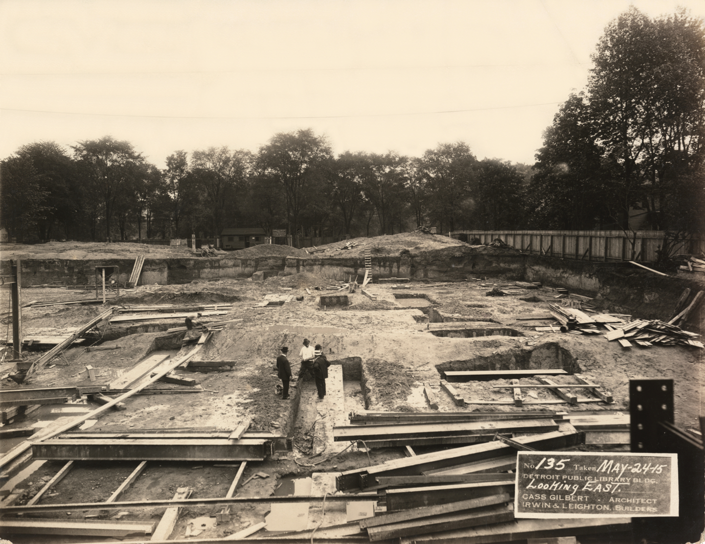 View of several men standing on construction site for foundation of Main Library, Detroit Public Library. Numerous trenches in ground; boards and beams on construction site. Printed on front: "No. 135. Taken May 24-15. Detroit Public Library bldg. Looking east. Cass Gilbert, architect. Irwin & Leighton, builders." Stamped on back: "Charles Ruel Messinger, commercial photographer, 1646 Woodward Ave., Detroit, Mich., phone North 6298."