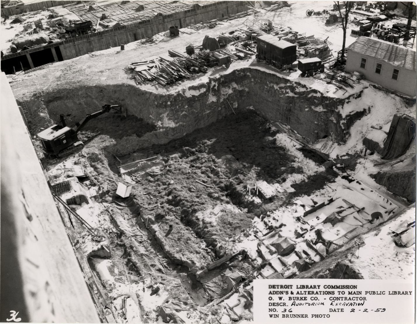 Bird's-eye view of power shovel excavating site for auditorium, Main Library, Detroit Public Library. Snow covers building materials and equipment. Printed on front: "Detroit Library Commission. Addn's & alterations to Main Public Library. O.W. Burke Co., contractor. Descr. auditorium excavation. No. 36. Date 2-2-59. Win Brunner, photo."