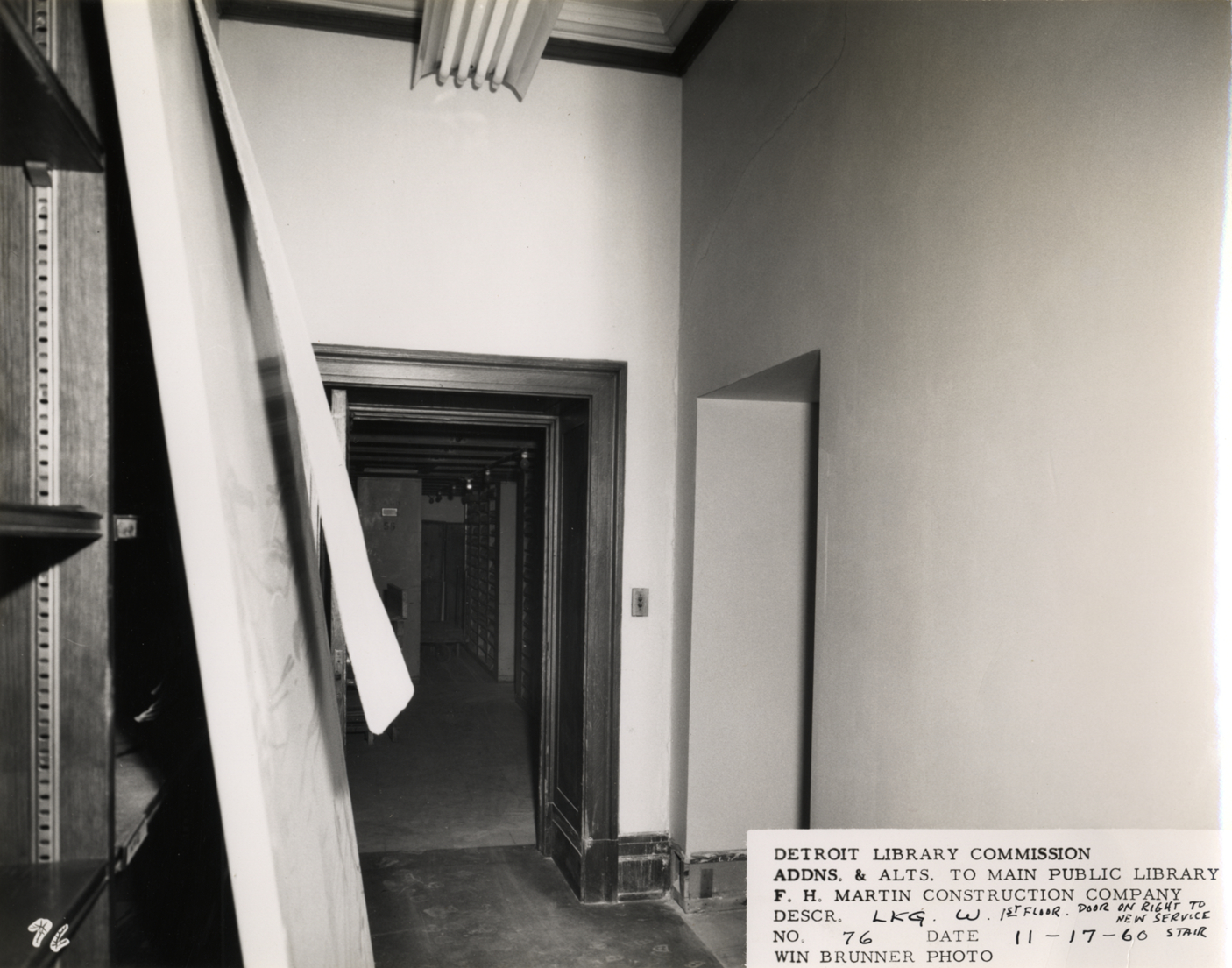 View into stack area on first floor, Main Library, Detroit Public Library during construction. Doorway to service stairway on right. Printed on front: "Detroit Library Commission. Addns. & alts. to Main Public Library. F.H. Martin Construction Company. Descr. lkg. w., 1st floor, door on right to new service stair. No. 76. Date: 11-17-60. Win Brunner, photo."