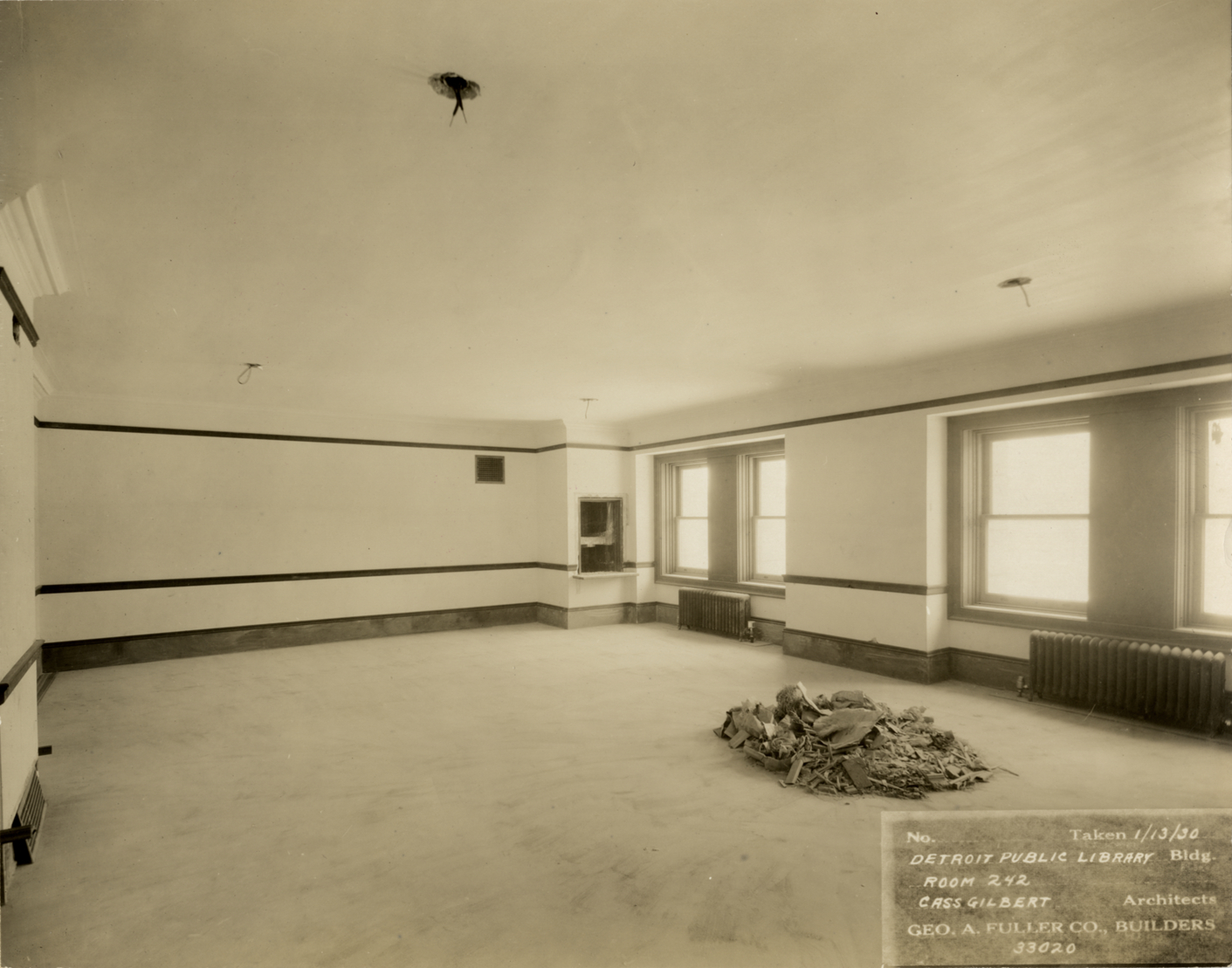 View of room 242, Main Library, Detroit Public Library during construction. Radiators under windows; some construction debris in center of room. Printed on front: "No. [blank]. Taken 1/13/30 [should be 1/13/20]. Detroit Public Library bldg., room 242. Cass Gilbert, architects. Geo. A. Fuller Co., builders, 33020." Stamped on back: "Manning Bros., commercial photographers, 504-505 Lincoln Building, corner State and Park Sts., Detroit, Mich."