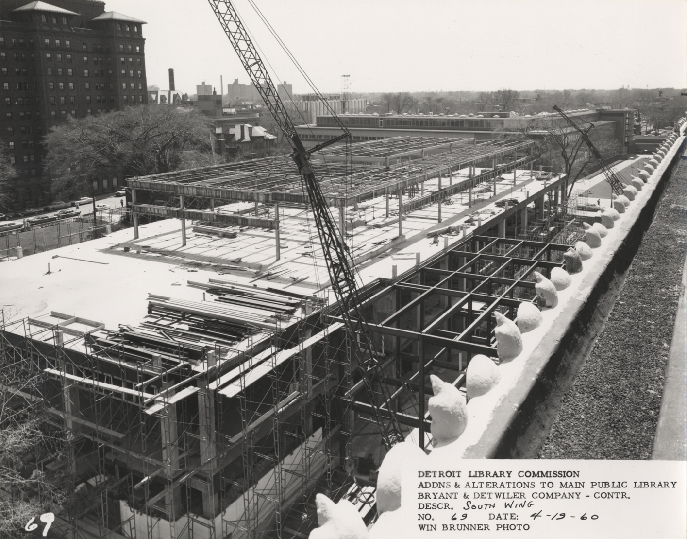 View from above of South Wing, Main Library, Detroit Public Library during construction. Cranes suspended over structural framework of building. Printed on front: "Detroit Library Commission. Addns & alterations to Main Public Library. Bryant & Detwiler Company, contr. Descr. South Wing. No. 69. Date: 4-19-60. Win Brunner, photo."