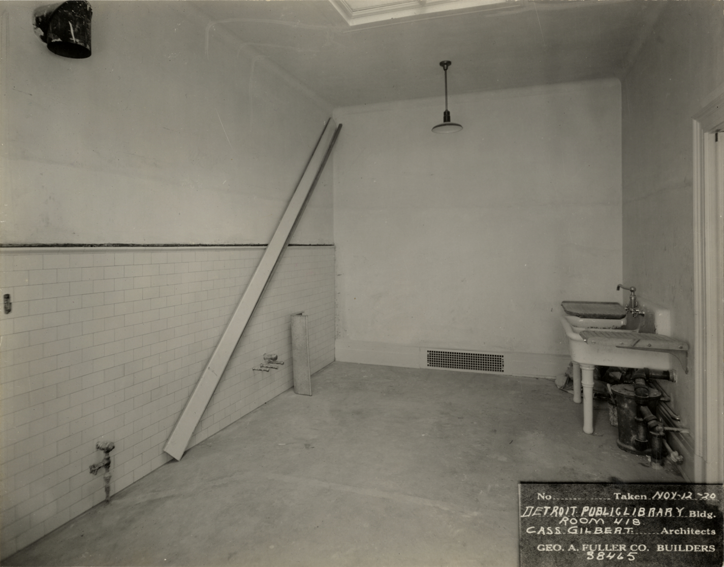 View of room 418, Main Library, Detroit Public Library during construction. Tiled room has sink and suspended light fixture. Printed on front: "No. [blank]. Taken Nov-12-20. Detroit Public Library bldg., room 418. Cass Gilbert, architects. Geo. A. Fuller Co., builders, 38465." Stamped on back: "Manning Bros., commercial photographers, 504-505 Lincoln Building, corner State and Park Sts., Detroit, Mich."