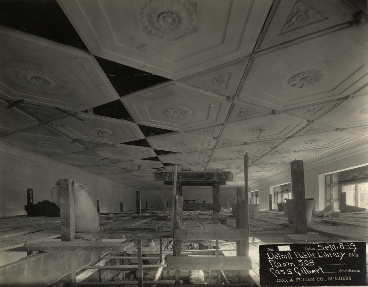 View of room 308, Main Library, Detroit Public Library during construction. Scaffolding directly below decorative ceiling. Printed on front: "No. [blank]. Taken Sept-8-19. Detroit Public Library bldg. Room 308. Cass Gilbert, architects. Geo. A. Fuller Co., builders." Stamped on back: "Manning Bros., commercial photographers, 22-24 Witherell St. Detroit, Michigan."