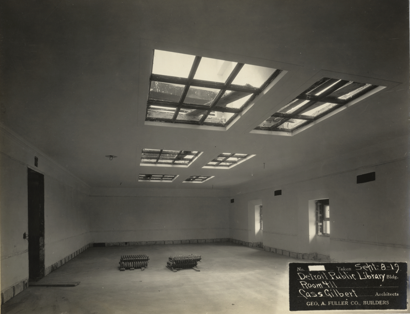 View of room 411, Main Library, Detroit Public Library during construction. Skylights visible in ceiling. Printed on front: "No. [blank]. Taken Sept-8-19. Detroit Public Library bldg. Room 411. Cass Gilbert, architects. Geo. A. Fuller Co., builders." Stamped on back: "Manning Bros., commercial photographers, 22-24 Witherell St. Detroit, Michigan."