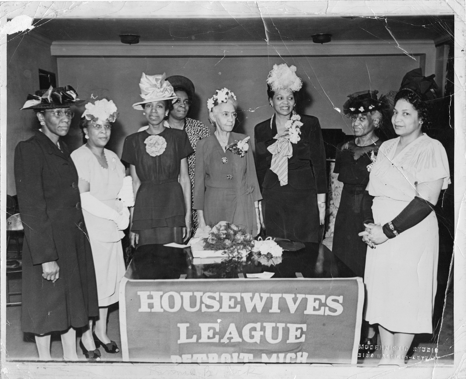 View of members of the Housewives League of Detroit. From left to right: Helen Malloy, [unknown], Nannie E. Black, Rosa Gragg, Fannie B. Peck, Violet Lewis, Christine Fuqua, [unknown]. Each woman is wearing a decorative hat; several have corsages. Banner in foreground reads: "Housewives League, Detroit, Mich." Embossed in the lower right corner: "Modernistic Studio, 3134 Hastings, Detroit." Handwritten on back: "1. Helen Malloy, 2. [blank]; 4. Rosa Gragg, 5. Fannie B. Peck, Violet Lewis, Christine Fuqua."