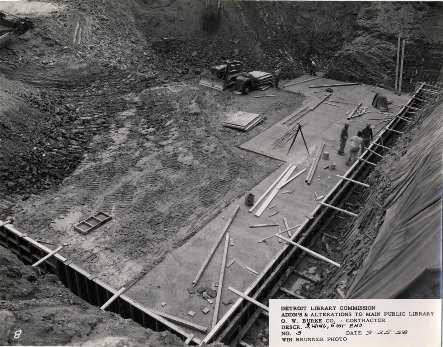 Foundation of South Wing, Main Library, Detroit Public Library during construction. Construction workers and bulldozer on construction site. Printed on front: "Detroit Library Commission. Addn's & alterations to Main Public Library. O.W. Burke Co., contractor. Descr. S. Wing, east end. No. 8. Date 9-25-58. Win Brunner, photo." Handwritten on back: "East side, South Wing."