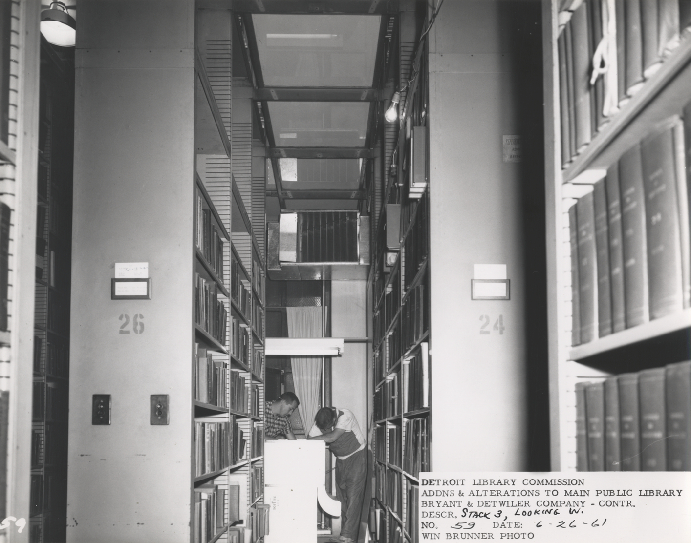 View of Stack 3, between ranges 24 and 26, Main Library, Detroit Public Library, during construction. Books on shelves; two workmen in background. Printed on front: "Detroit Library Commission. Addns & alterations to Main Public Library. Bryant & Detwiler Company, contr. Descr. Stack 3, looking w. No. 59. Date: 6-26-61. Win Brunner, photo."
