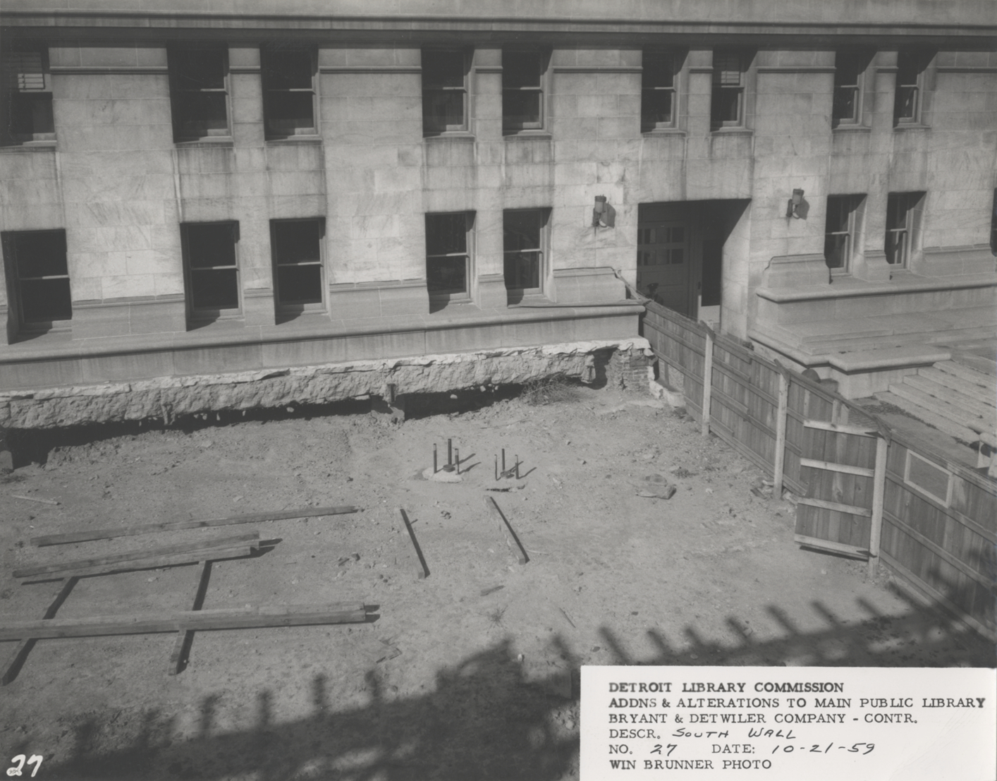 View of south wall of Main Library, Detroit Public Library. Foundation partially broken; wooden fence on right. Printed on front: "Detroit Library Commission. Addns & alterations to Main Public Library. Bryant & Detwiler Company, contr. Descr. south wall. No. 27. Date: 10-21-59. Win Brunner, photo."