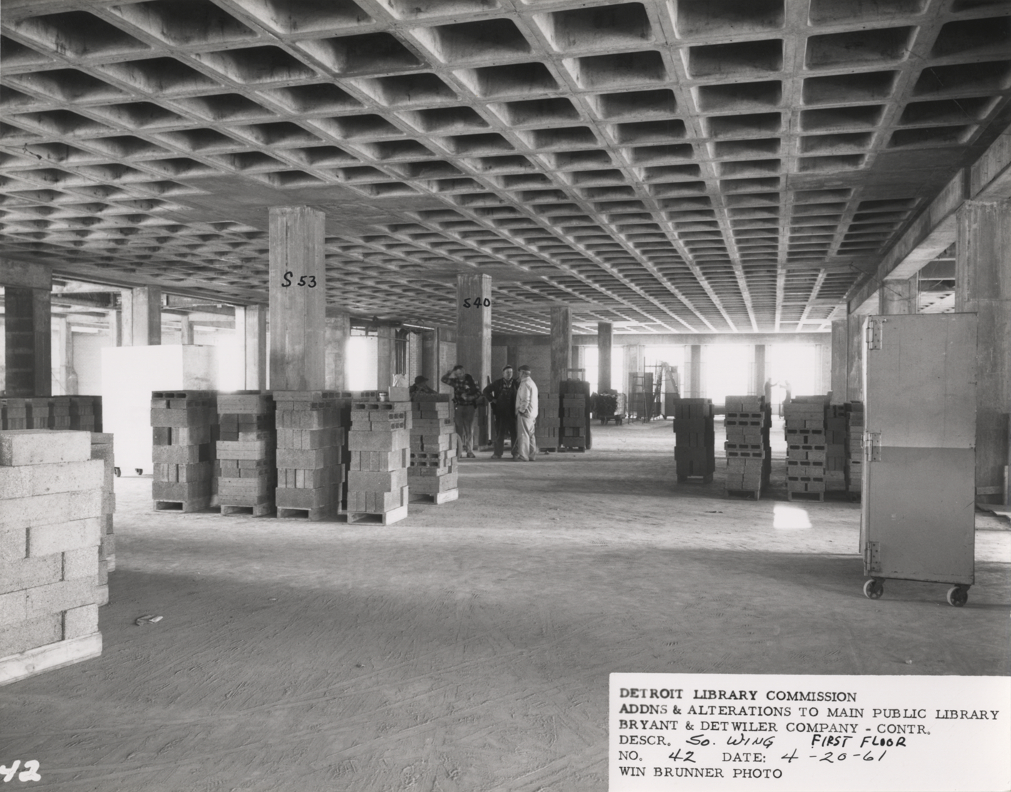 View of first floor, South Wing, Main Library, Detroit Public Library during construction. Construction workers gather in center of room; piles of concrete bricks around columns. Handwritten on columns: "S53; S40." Printed on front: "Detroit Library Commission. Addns & alterations to Main Public Library. Bryant & Detwiler Company, contr. Descr. So. Wing, first floor. No. 42. Date: 4-20-61. Win Brunner, photo."