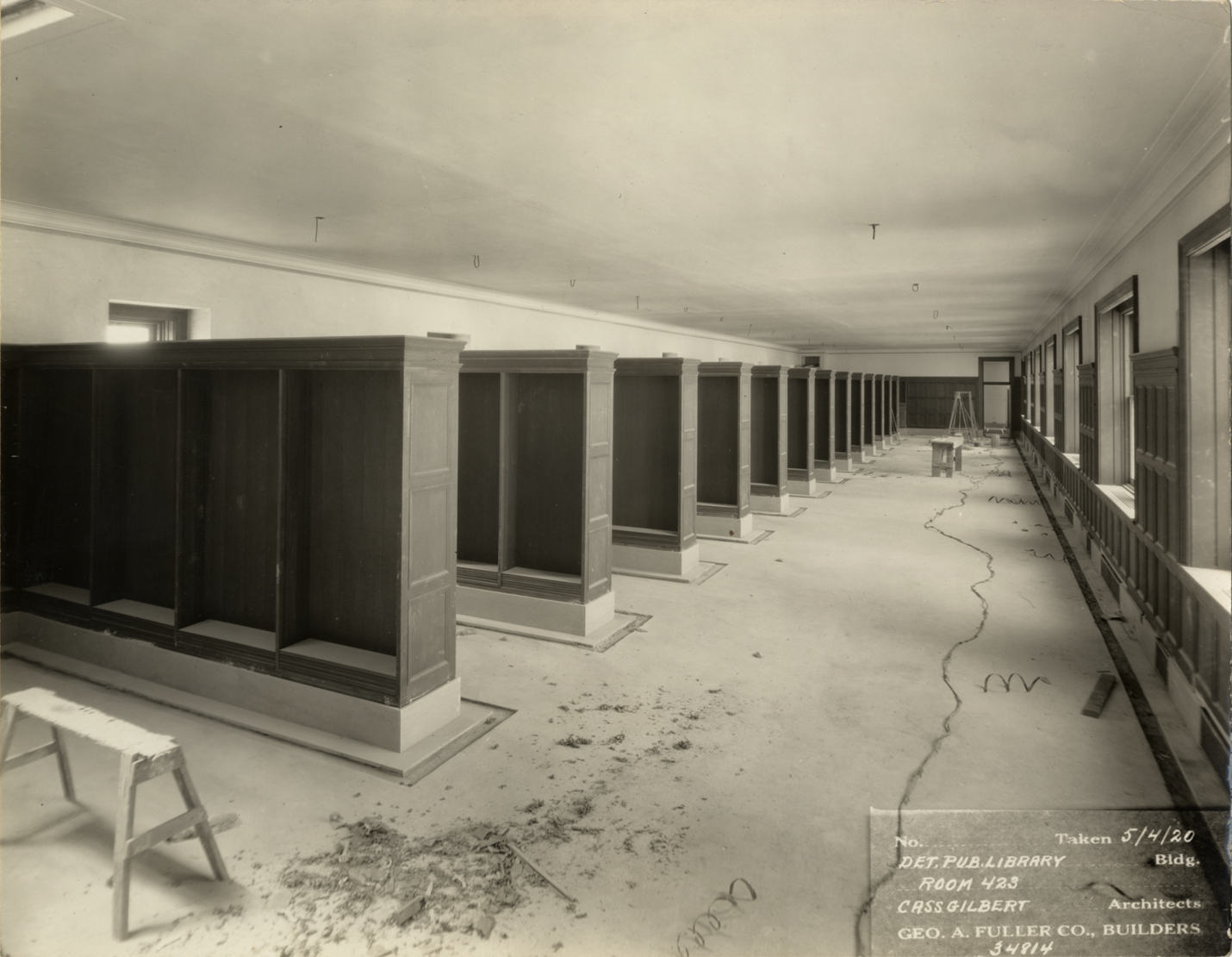 View of room 423, Main Library, Detroit Public Library during construction. Rows of bookshelves under construction; sawhorses and some construction debris in room. Printed on front: "No. [blank]. Taken 5/4/20. Det. Pub. Library bldg., room 423. Cass Gilbert, architects. Geo. A. Fuller Co., builders, 34814." Stamped on back: "Manning Bros., commercial photographers, 504-505 Lincoln Building, corner State and Park Sts., Detroit, Mich."