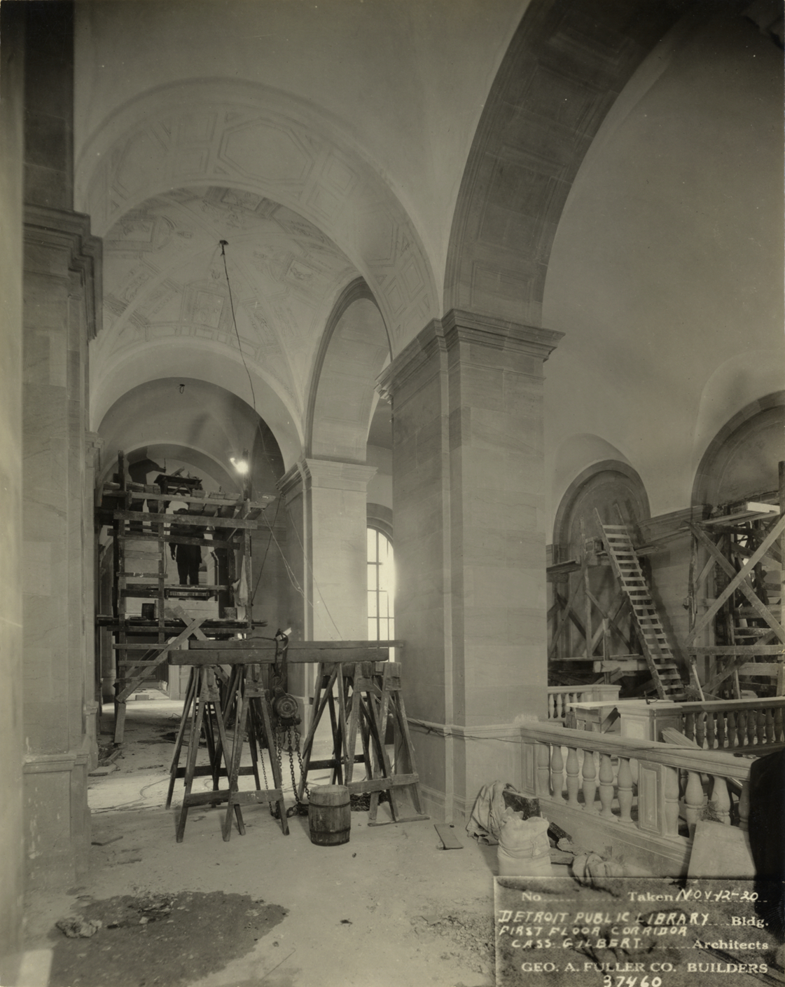 View of first floor corridor, Main Library, Detroit Public Library during construction. Arched corridor; workmen stand on scaffolding. Sawhorses, ladder and construction materials in hallway. Printed on front: "No. [blank]. Taken Nov-12-20. Detroit Public Library bldg., first floor corridor. Cass Gilbert, architects. Geo. A. Fuller Co., builders, 37460." Stamped on back: "Manning Bros., commercial photographers, 504-505 Lincoln Building, corner State and Park Sts., Detroit, Mich."