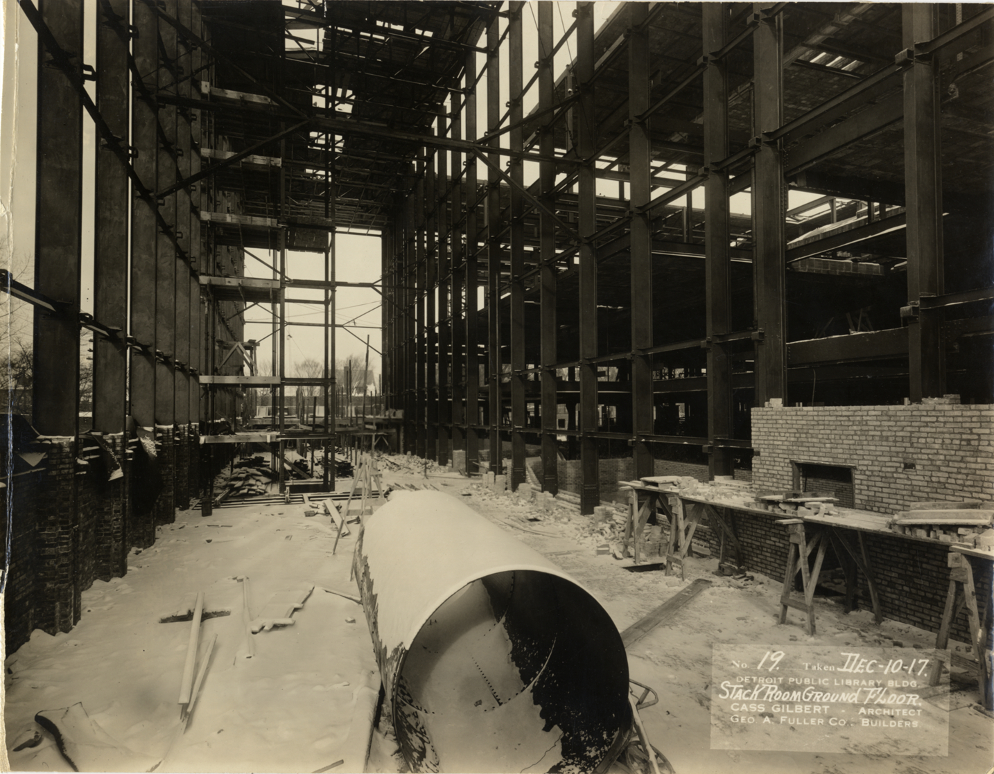 View from inside of framework of Main Library, Detroit Public Library during construction, showing site of stack room. Sawhorses and length of pipe inside structure. Printed on front: "No. 19. Taken Dec-10-17. Detroit Public Library bldg. Stack room ground floor. Cass Gilbert, architect. Geo. A. Fuller Co., builders." Stamped on back: "Charles R. Messinger, commercial photographer, 1646 Woodward Ave., Detroit, Mich., Market 6298."