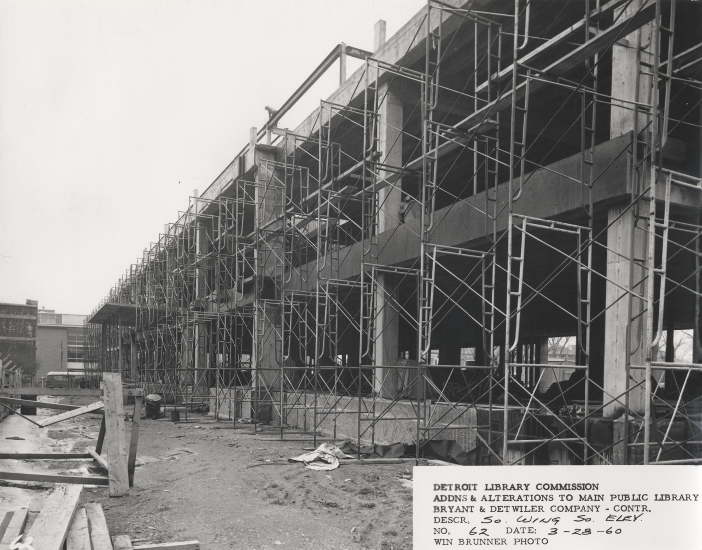 View of South Wing, Main Library, Detroit Public Library during construction. Scaffolding covers structural framework of building. Printed on front: "Detroit Library Commission. Addns & alterations to Main Public Library. Bryant & Detwiler Company, contr. Descr. So. Wing, so. elev. No. 62. Date: 3-28-60. Win Brunner, photo."