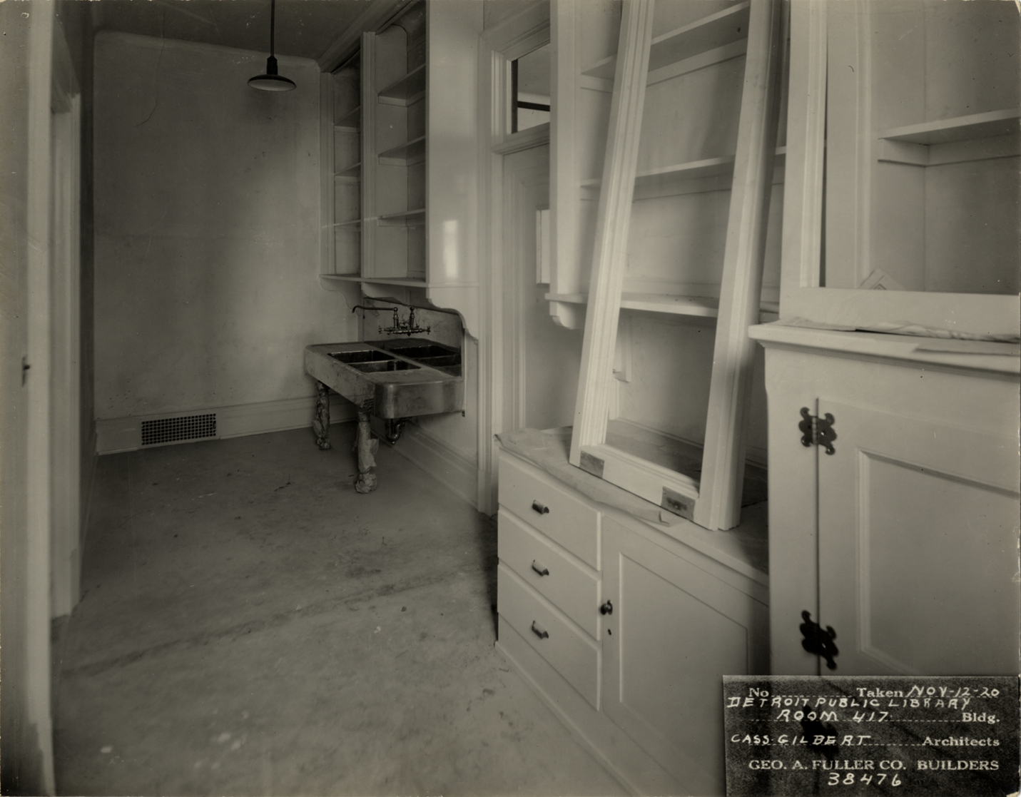 View of room 417, Main Library, Detroit Public Library during construction. Room has sink, shelves and storage cabinets. Printed on front: "No. [blank]. Taken Nov-12-20. Detroit Public Library bldg., room 417. Cass Gilbert, architects. Geo. A. Fuller Co., builders, 38476." Stamped on back: "Manning Bros., commercial photographers, 504-505 Lincoln Building, corner State and Park Sts., Detroit, Mich."