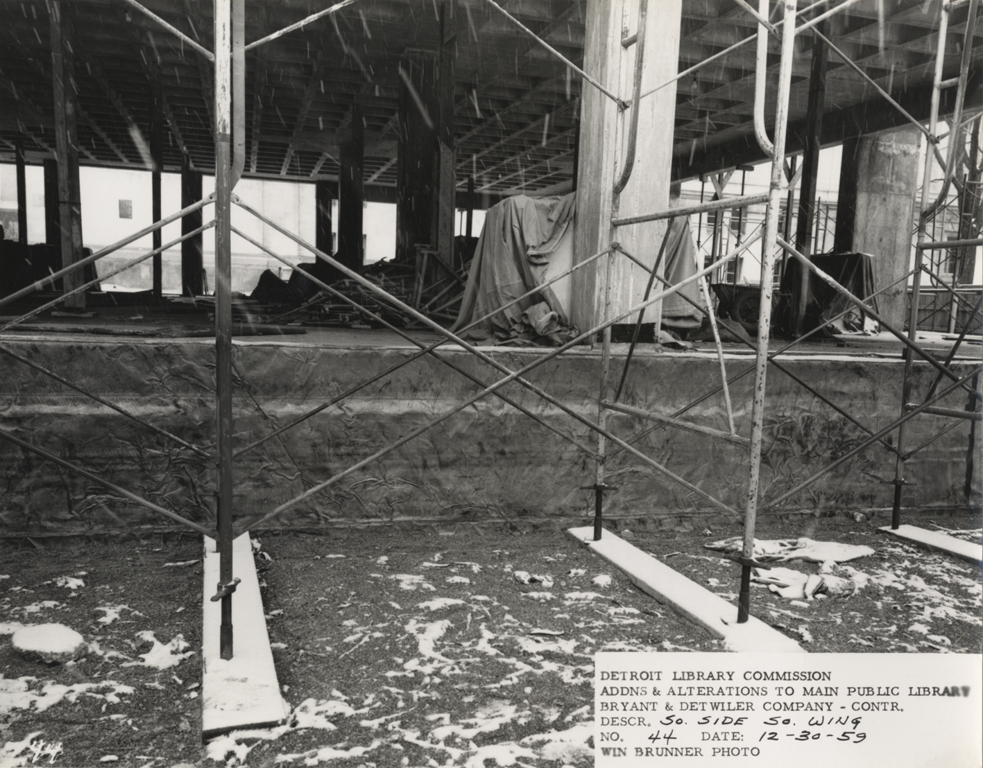 View of interior of South Wing, Main Library, Detroit Public Library during construction. Draped construction materials on site; scaffolding in foreground. Printed on front: "Detroit Library Commission. Addns & alterations to Main Public Library. Bryant & Detwiler Company, contr. Descr. so. side So. Wing. No. 44. Date: 12-30-59. Win Brunner, photo."