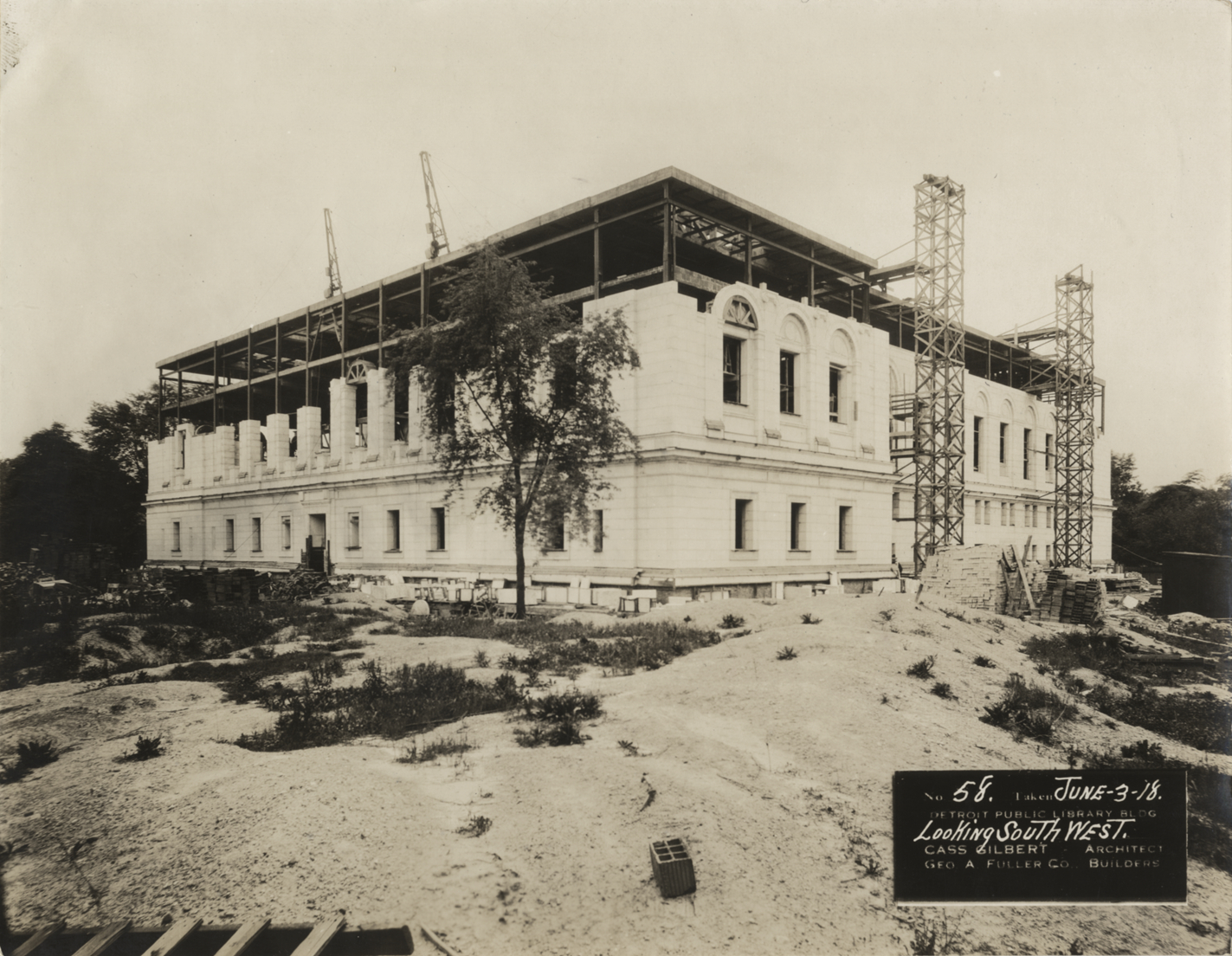 View at an angle of Main Library, Detroit Public Library during construction, facing southwest. Structural frame of building with nearly completed facade; scaffolding on side. Two cranes on roof. Printed on front: "No. 58. Taken June-3-18. Detroit Public Library bldg., looking southwest. Cass Gilbert, architect. Geo. A. Fuller Co., builders." Stamped on back: "Charles R. Messinger, commercial photographer, 1646 Woodward Ave., Detroit, Mich., Market 6298."