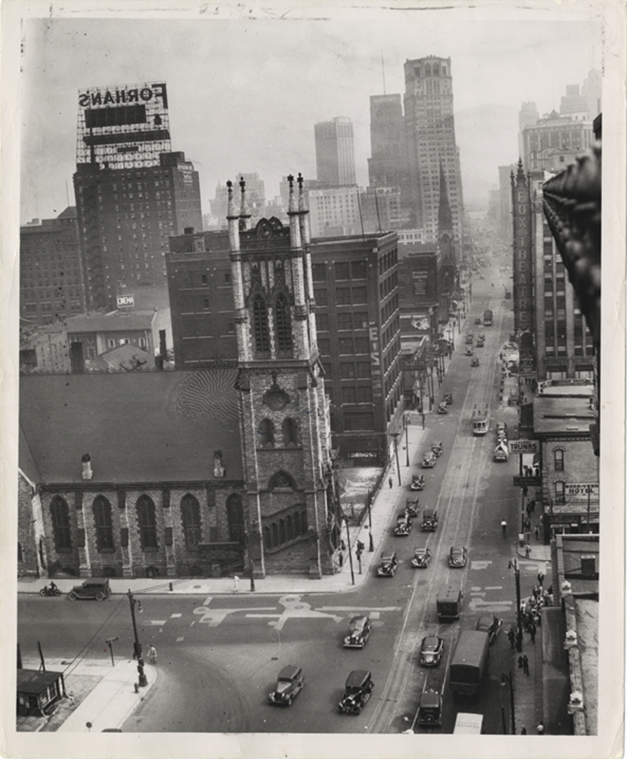 View of St. John's Protestant Episcopal Church on the corner of Woodward Avenue and Vernor Street. Buildings in background. Handwritten on back: "Sts. Woodward, east side ... Vernor, ca. 1937."