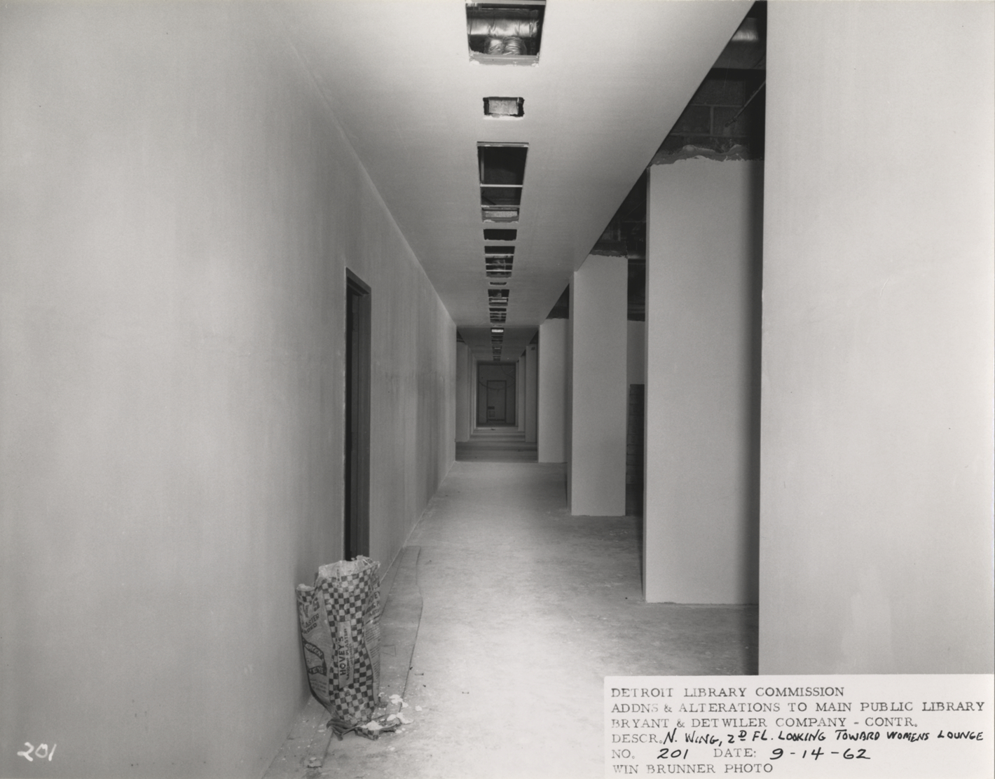 Interior view of second floor, North Wing, Main Library, Detroit Public Library during construction. Bag of plaster in foreground. Printed on front: "Detroit Library Commission. Addns & alterations to Main Public Library. Bryant & Detwiler Company, contr. Descr. N. Wing, 2d fl. looking toward womens lounge. No. 201. Date: 9-14-62. Win Brunner, photo."