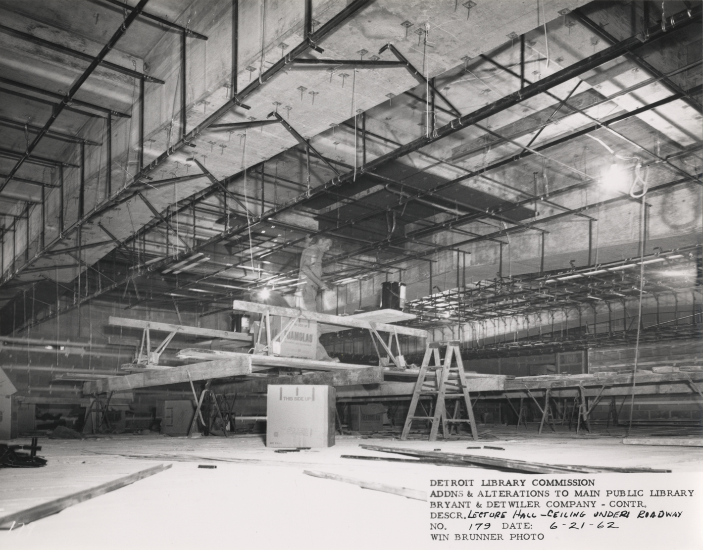 View of lecture hall ceiling, Main Library, Detroit Public Library under construction. Pipes and ductwork overhead; construction equipment and materials on floor. Printed on front: "Detroit Library Commission. Addns & alterations to Main Public Library. Bryant & Detwiler Company, contr. Descr. lecture hall, ceiling under roadway. No. 179. Date: 6-21-62. Win Brunner, photo."