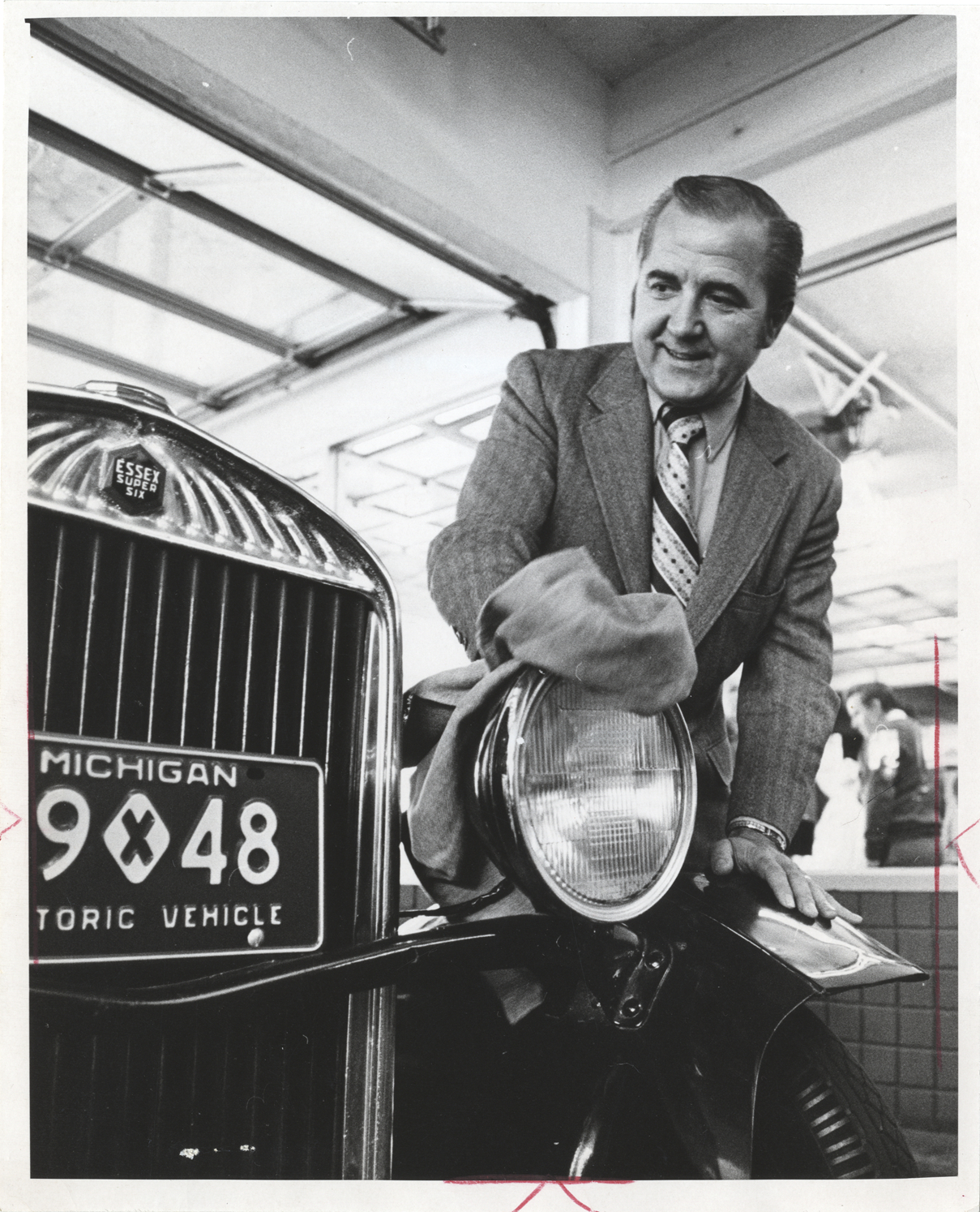Portrait of Detroit mayor Roman S. Gribbs, examining an Essex automobile. Stamped on back: "Jimmy Tafoya, Free Press staff photographer." Label on back: "In the midst of a busy day, Mayor Roman S. Gribbs stopped to inspect antique Essex. The colossal Archives of American Art Auction and Garage Sale comes to an end at 5." Handwritten on back: "Mayor Roman Gribbs."