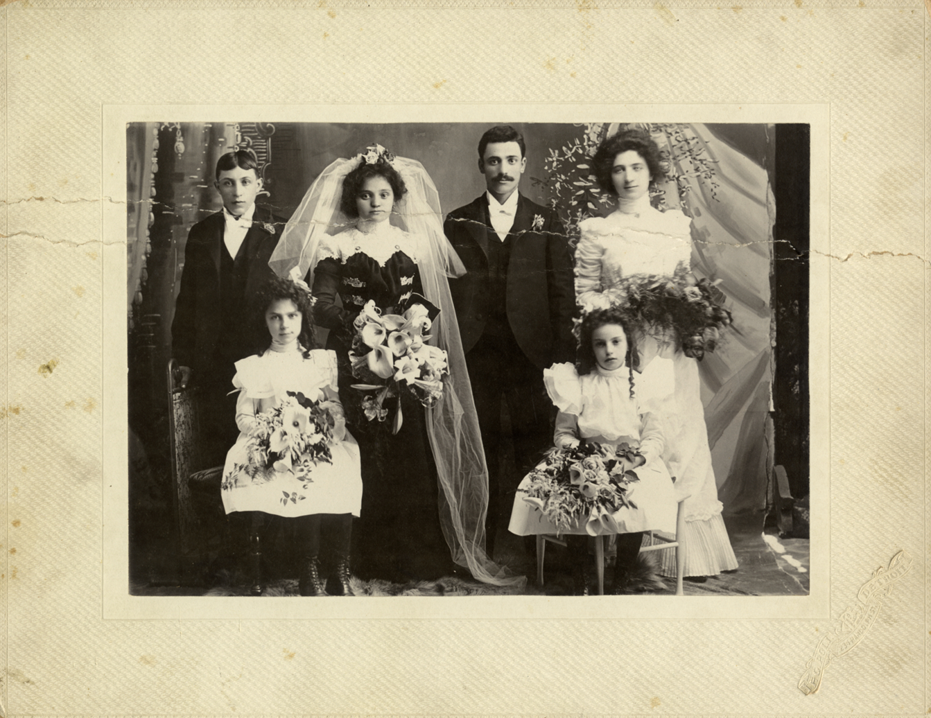 Portrait of couple in wedding attire; bride holds bouquet of flowers. Young man and woman stand next to bride and groom; two young girls holding bouquets of flowers sit in front row. Embossed on mat: "F.G. Poli, 236 Randolph St., Detroit."