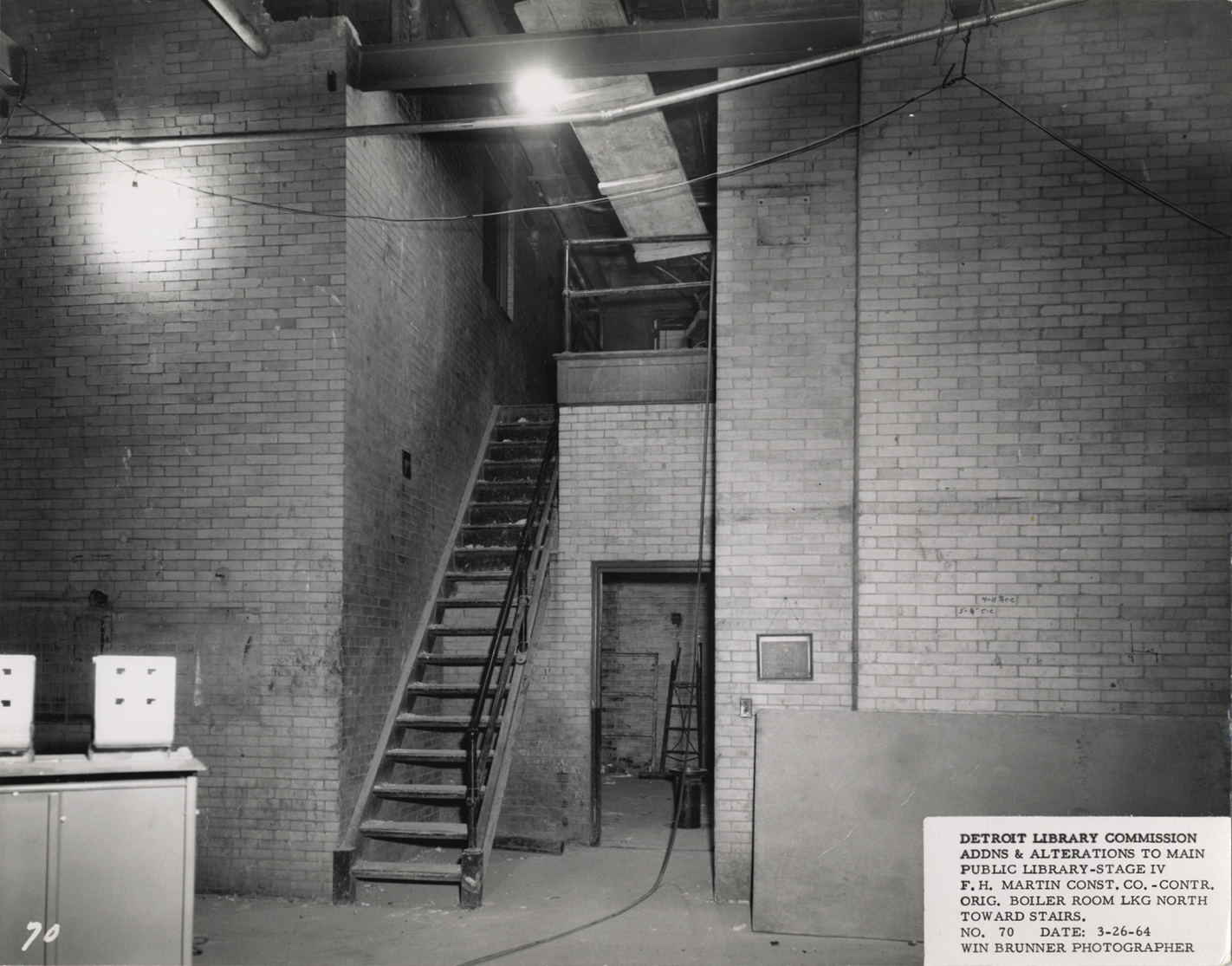 View of staircase in boiler room, Main Library, Detroit Public Library. Printed on front: "Detroit Library Commission. Addns & alterations to Main Public Library, Stage IV. F.H. Martin Const. Co., contr. Orig. boiler room lkg. north toward stairs. No. 70. Date: 3-26-64. Win Brunner, photographer."