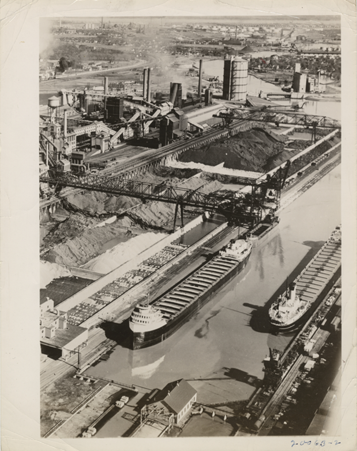 View of two freighters along Detroit riverfront; factory in background.