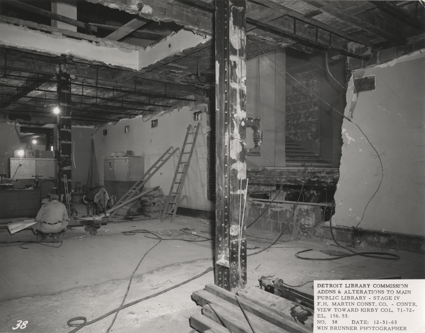 View of construction worker and equipment in unidentified room, Main Library, Detroit Public Library during construction. Printed on front: "Detroit Library Commission. Addns & alterations to Main Public Library, Stage IV. F.H. Martin Const. Co., contr. View toward Kirby col. 71-72, el. 156.53. No. 38. Date: 12-31-63. Win Brunner, photographer."