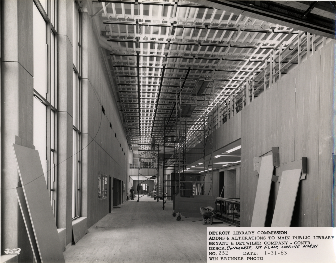 View of first floor of Cass Avenue concourse, Main Library, Detroit Public Library during construction. Worker stands on scaffolding to install fluorescent bulbs in ceiling. Printed on front: "Detroit Library Commission. Addns & alterations to Main Public Library. Bryant & Detwiler Company, contr. Descr. concourse, 1st floor looking north. No. 252. Date: 1-31-63. Win Brunner, photo."