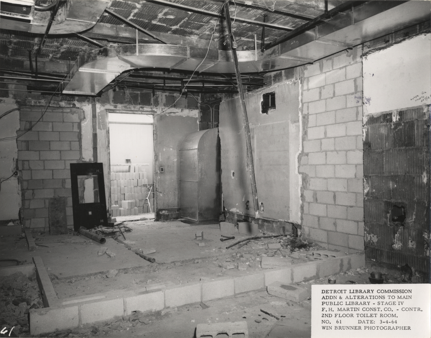 View of second floor restroom, Main Library, Detroit Public Library during construction. Ductwork overhead; construction debris on floor. Printed on front: "Detroit Library Commission. Addns & alterations to Main Public Library, Stage IV. F.H. Martin Const. Co., contr. 2nd floor toilet room. No. 61. Date: 3-4-64. Win Brunner, photographer."