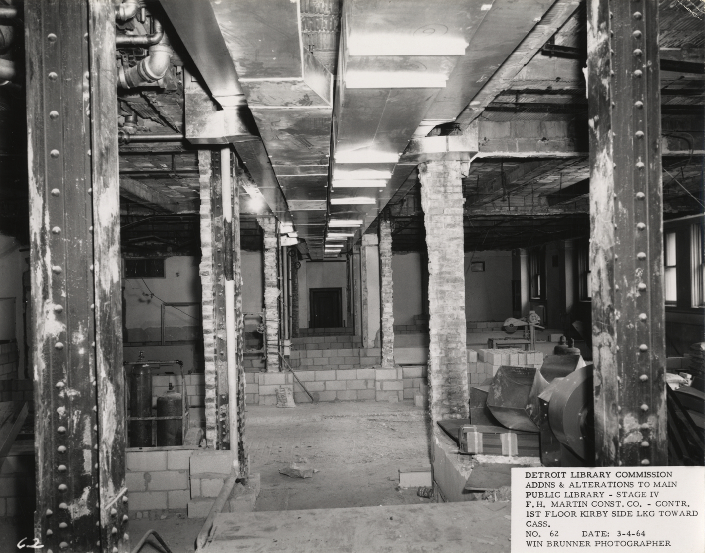 View of first floor, Main Library, Detroit Public Library during construction. Printed on front: "Detroit Library Commission. Addns & alterations to Main Public Library, Stage IV. F.H. Martin Const. Co., contr. 1st floor Kirby side lkg. toward Cass. No. 62. Date: 3-4-64. Win Brunner, photographer."