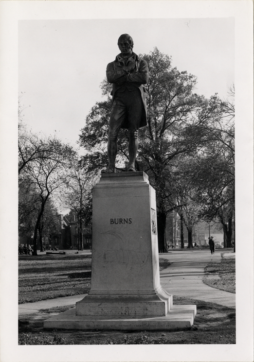 View of Robert Burns statue, located in Cass Park at Temple and Second Avenue. Monument was designed by George A. Lawson. Inscription reads: "Burns. From scenes like these old Scotia's grandeur springs. Nae man can tether time nor tide. Wee modest crimson-tipped flower thou's met me in an evil hour. The highest mead of praise, belongs to him who makes a people's songs, who strikes one note the common good, one chord a wider brotherhood."