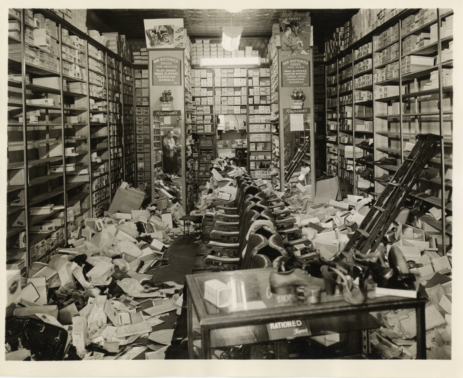 Interior view of Kapsen Shoe Store during 1943 riot in Detroit showing piles of empty shoeboxes and debris on floor. Man holding overcoat reflected in mirror at back of store. Handwritten on back: "1943 (Kapsen Shoe Store)."