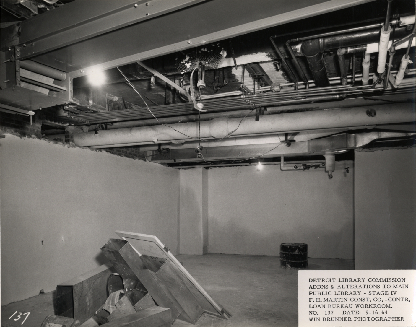 View of Loan Bureau workroom, Main Library, Detroit Public Library during construction. Pipes overhead in ceiling; pieces of ductwork on floor. Printed on front: "Detroit Library Commission. Addns & alterations to Main Public Library, Stage IV. F.H. Martin Const. Co., contr. Loan Bureau workroom. No. 137. Date: 9-16-64. Win Brunner, photographer."