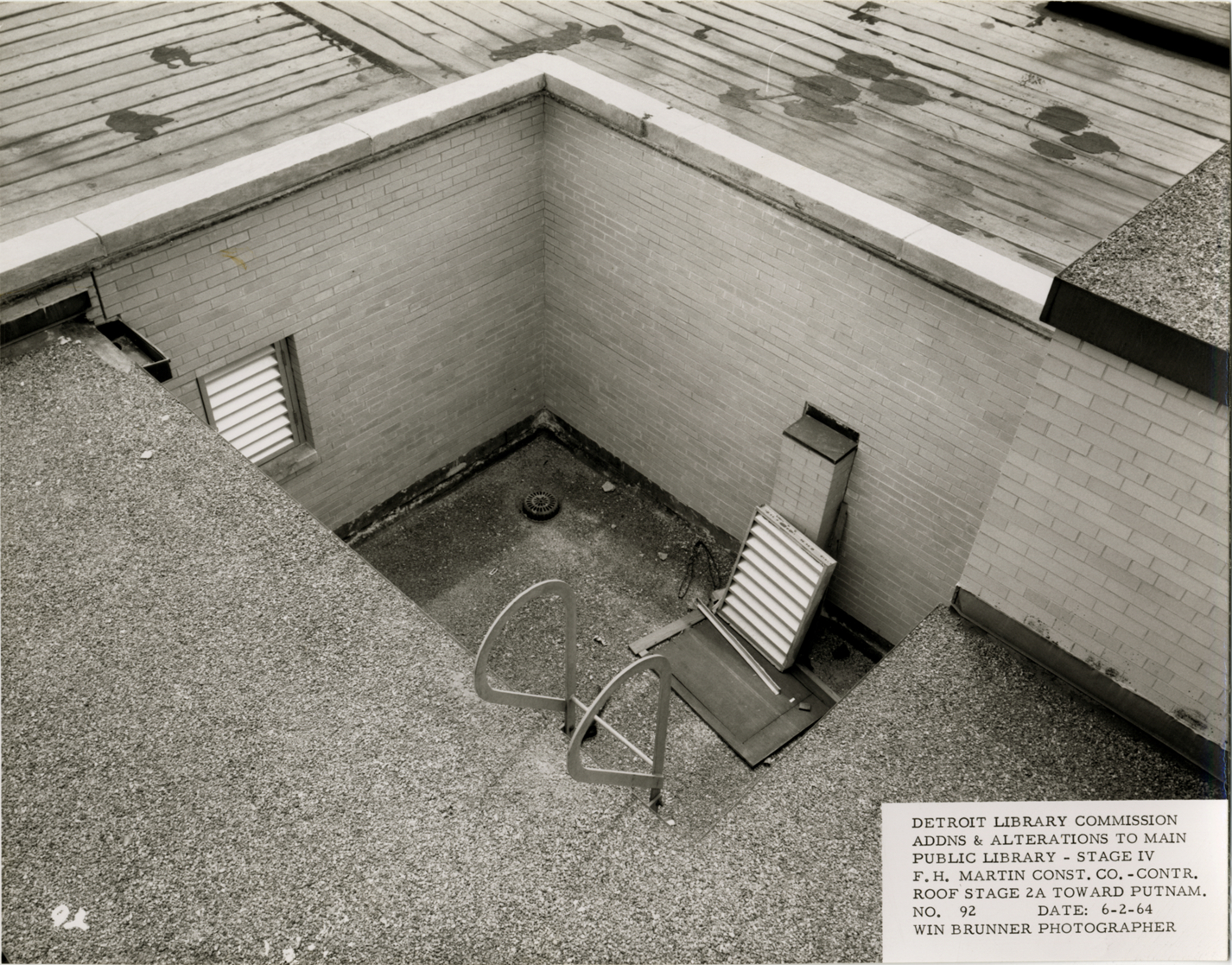 Detail of roof, Main Library, Detroit Public Library during construction. Printed on front: "Detroit Library Commission. Addns & alterations to Main Public Library, Stage IV. F.H. Martin Const. Co., contr. Roof stage 2A toward Putnam. No. 92. Date: 6-2-64. Win Brunner, photographer."