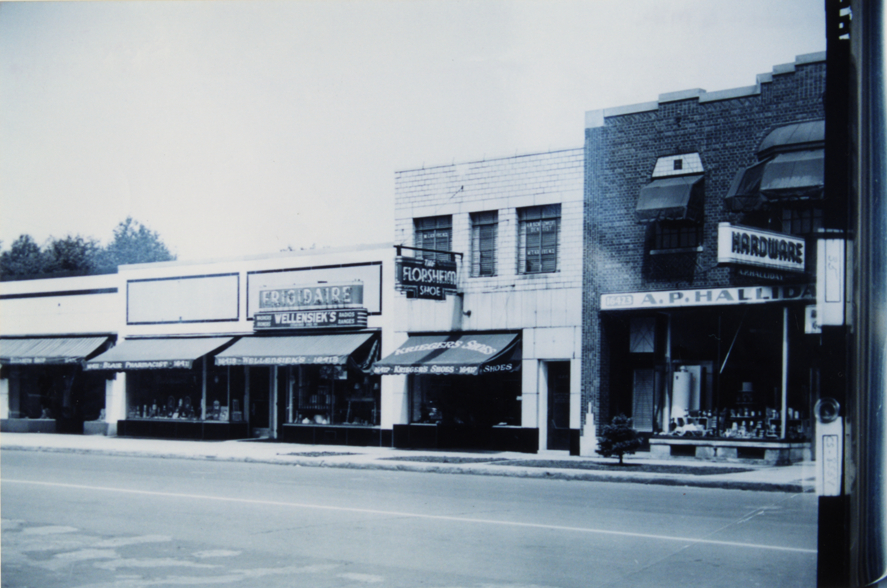 View of stores on Six Mile Rd.; signs advertise Wellensiek's, Kriegger's shoes and A.P. Halliday hardware.