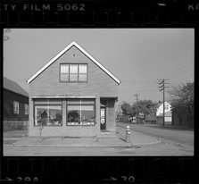 View of two-story, front-gabled store on corner lot. Fire hydrant on corner.